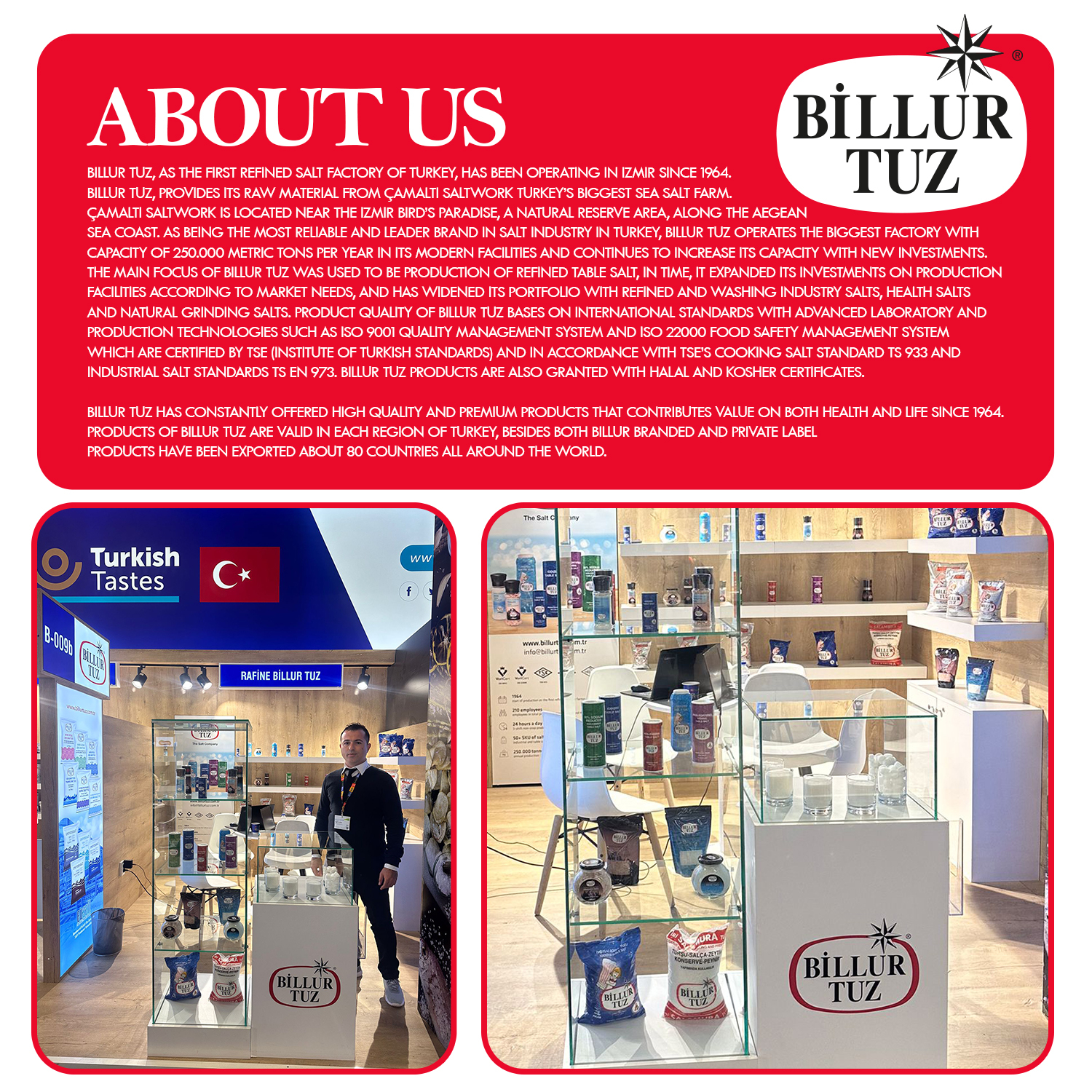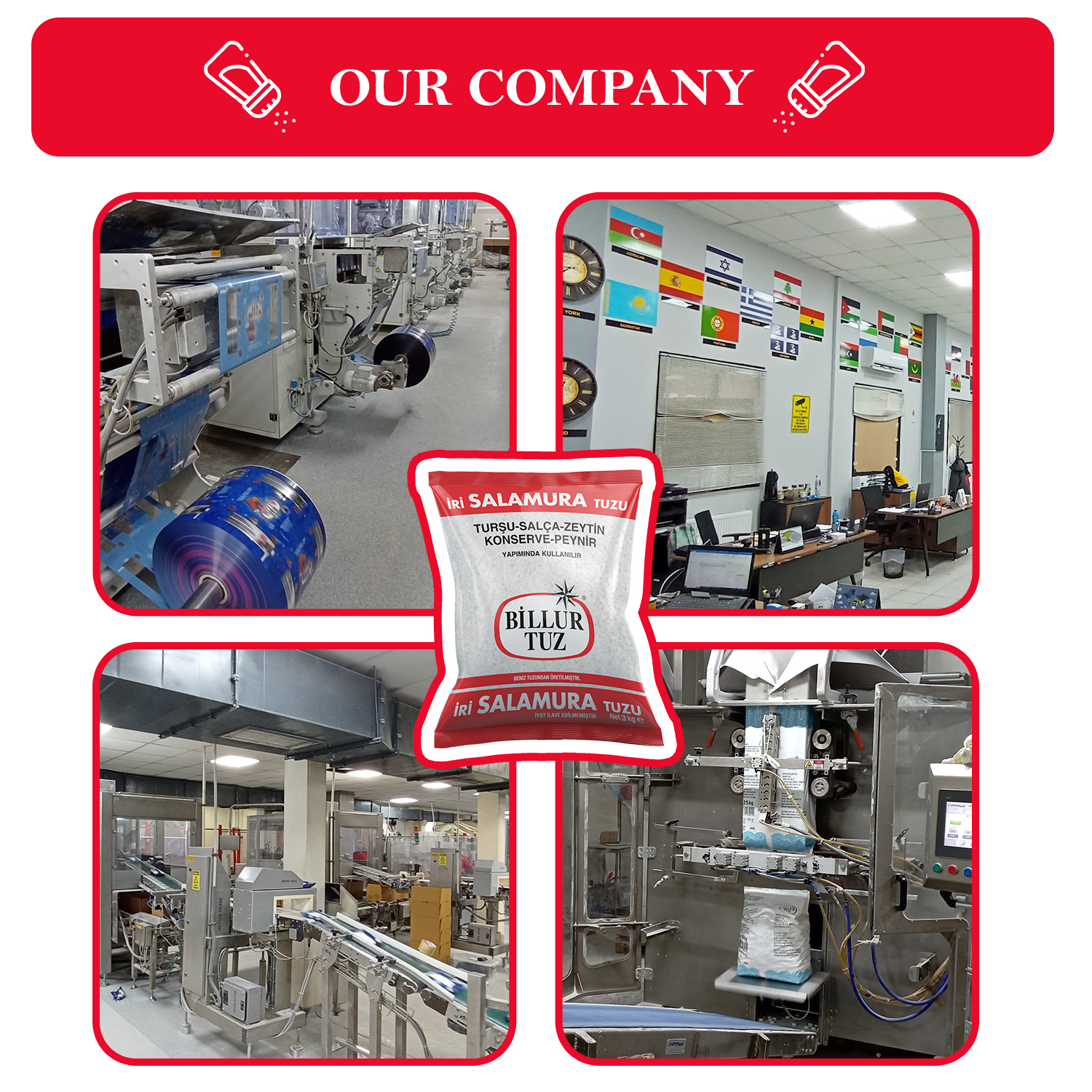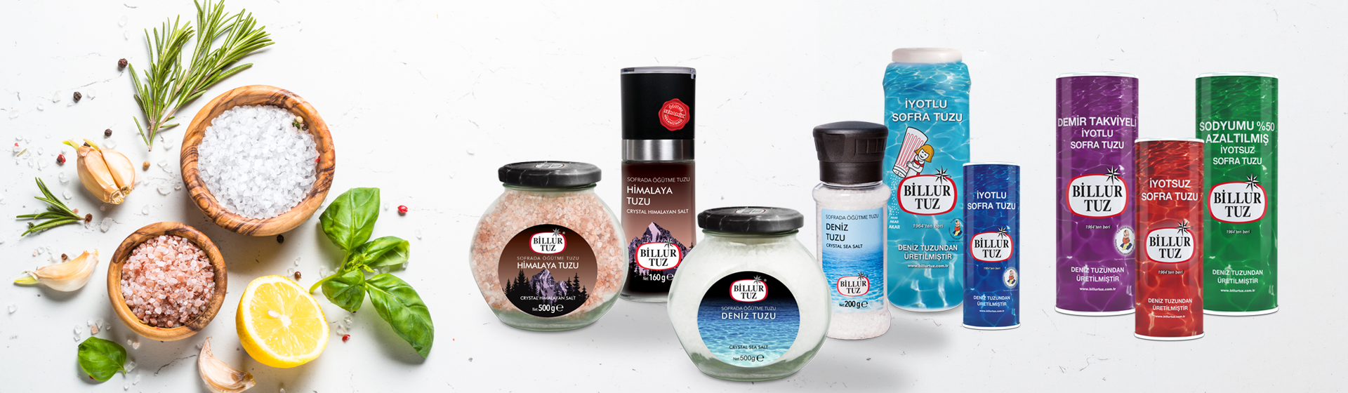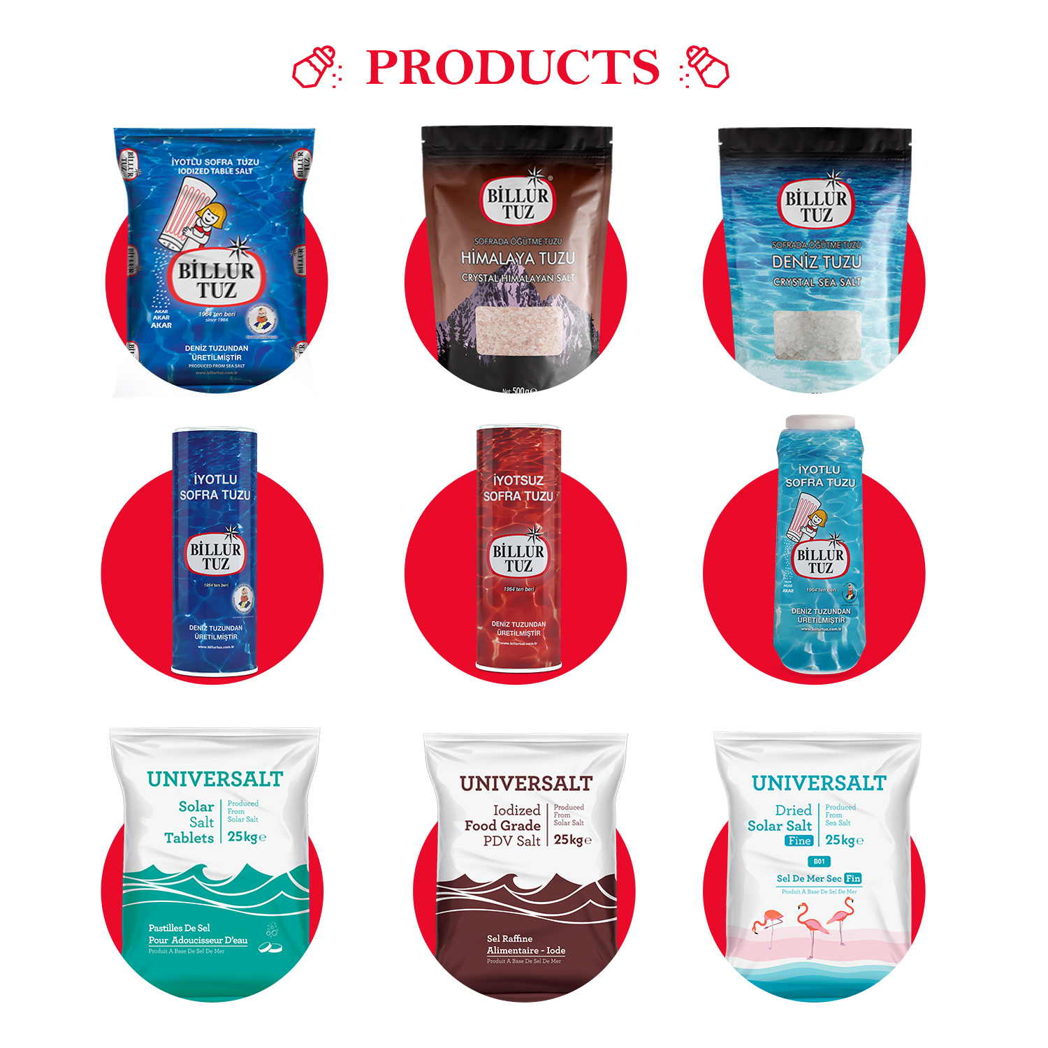 Ana ürünler:750 Gr rafine iyotlu masa tuzu, 500 Gr Himlaya tuz Doypack,500 Gr toprak deniz tuzu Doypack tablo için, 160 Gr Premium ya Premium tuzluk, rafine Tablet